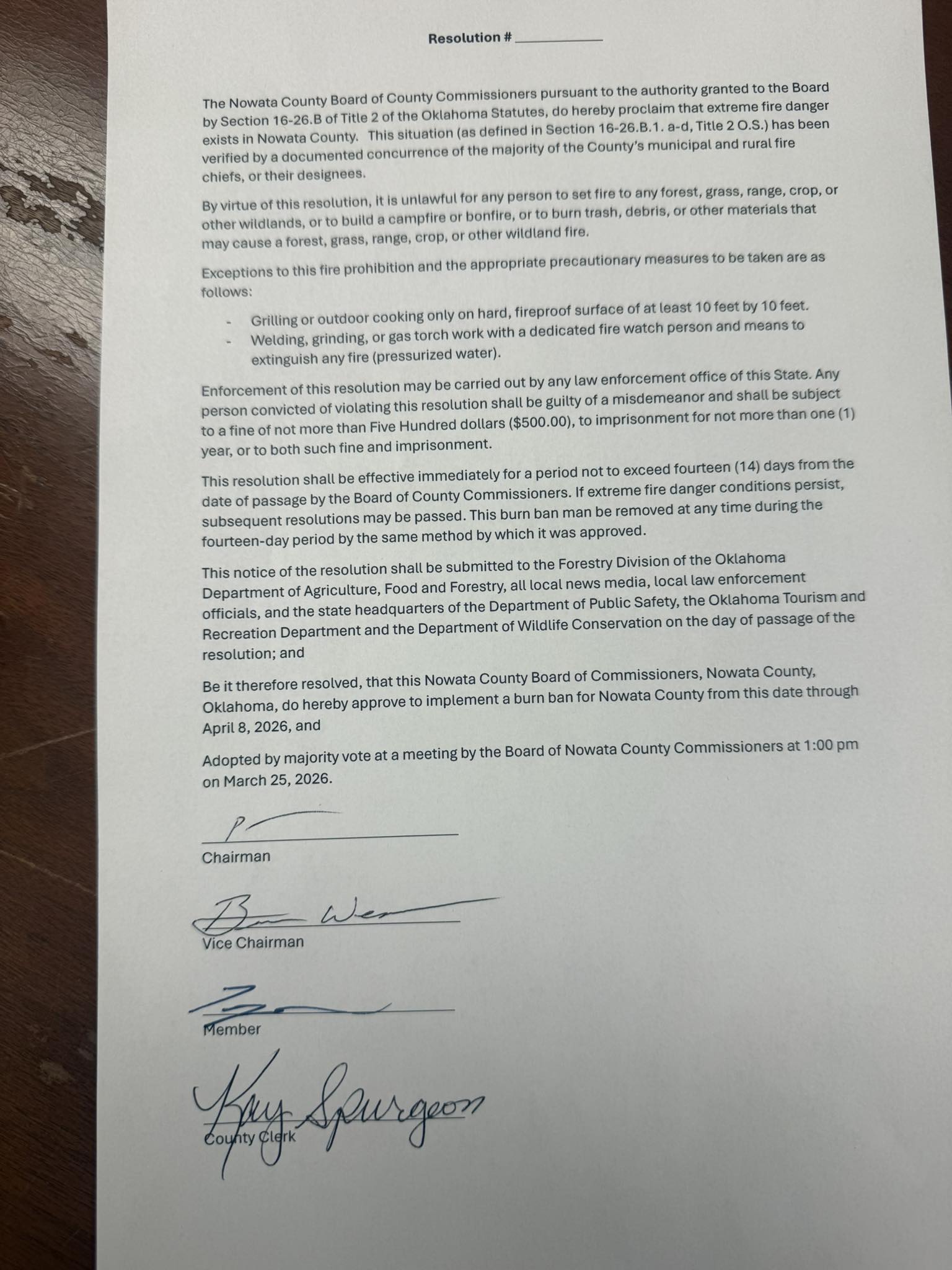 Be it therefore resolved, that this Nowata County Board of Commissioners, Nowata County, Oklahoma, do hereby approve to implement a burn ban for Nowata County from this date (March 25th, 2026) through April 8th, 2026, and